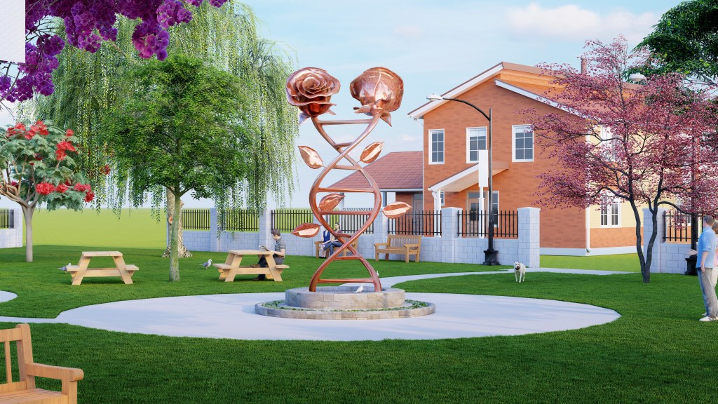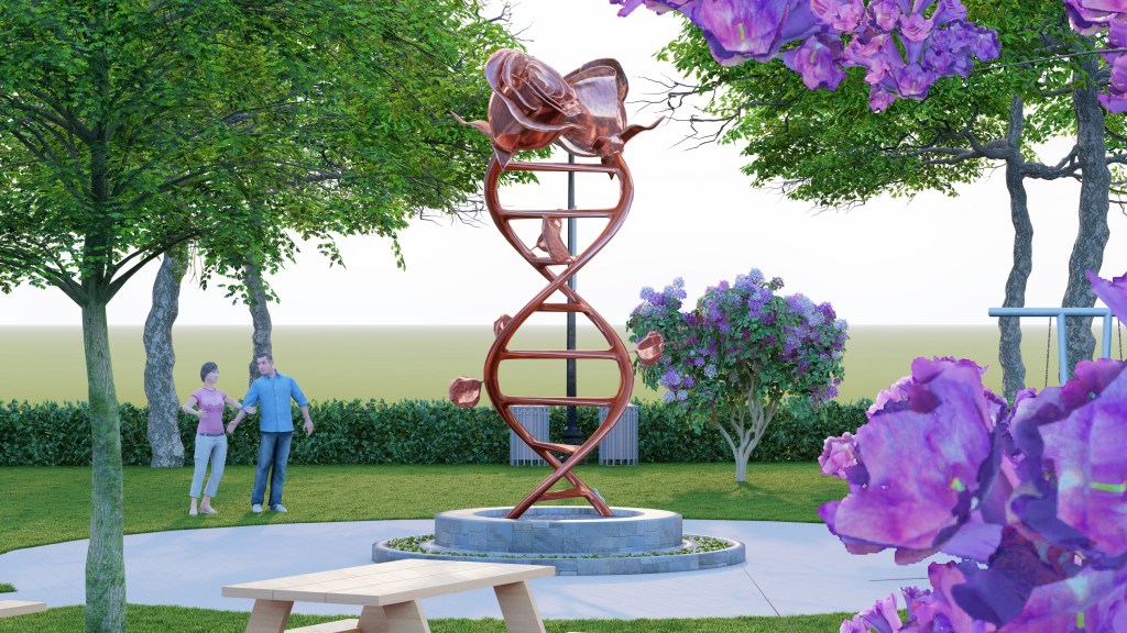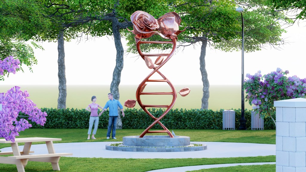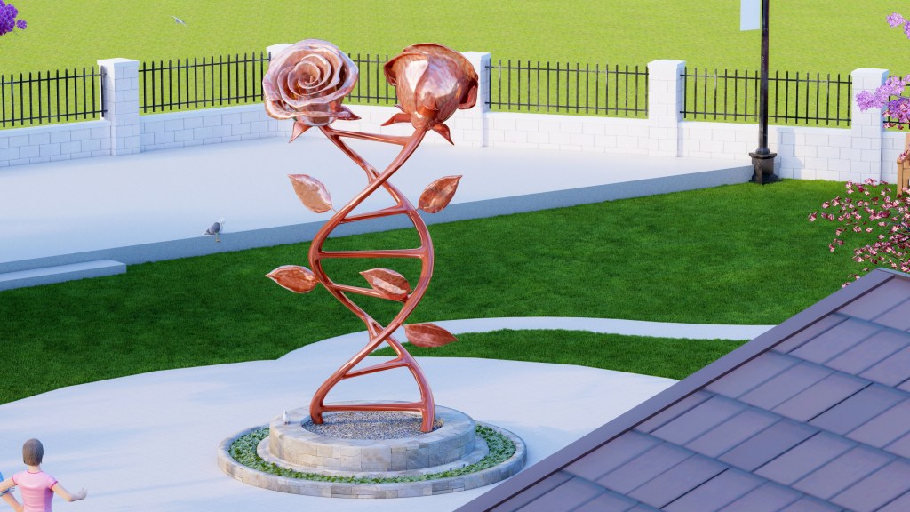 In the quiet anticipation of a sunlit urban landscape, “Dream Roses” emerges, a life-size sculpture that delicately weaves the essence of both nature and human DNA. Much like life’s unfolding chapters and the rhythmic pulse of the natural world, dreams, too, possess an innate ability to carve their path through the tapestry of existence.